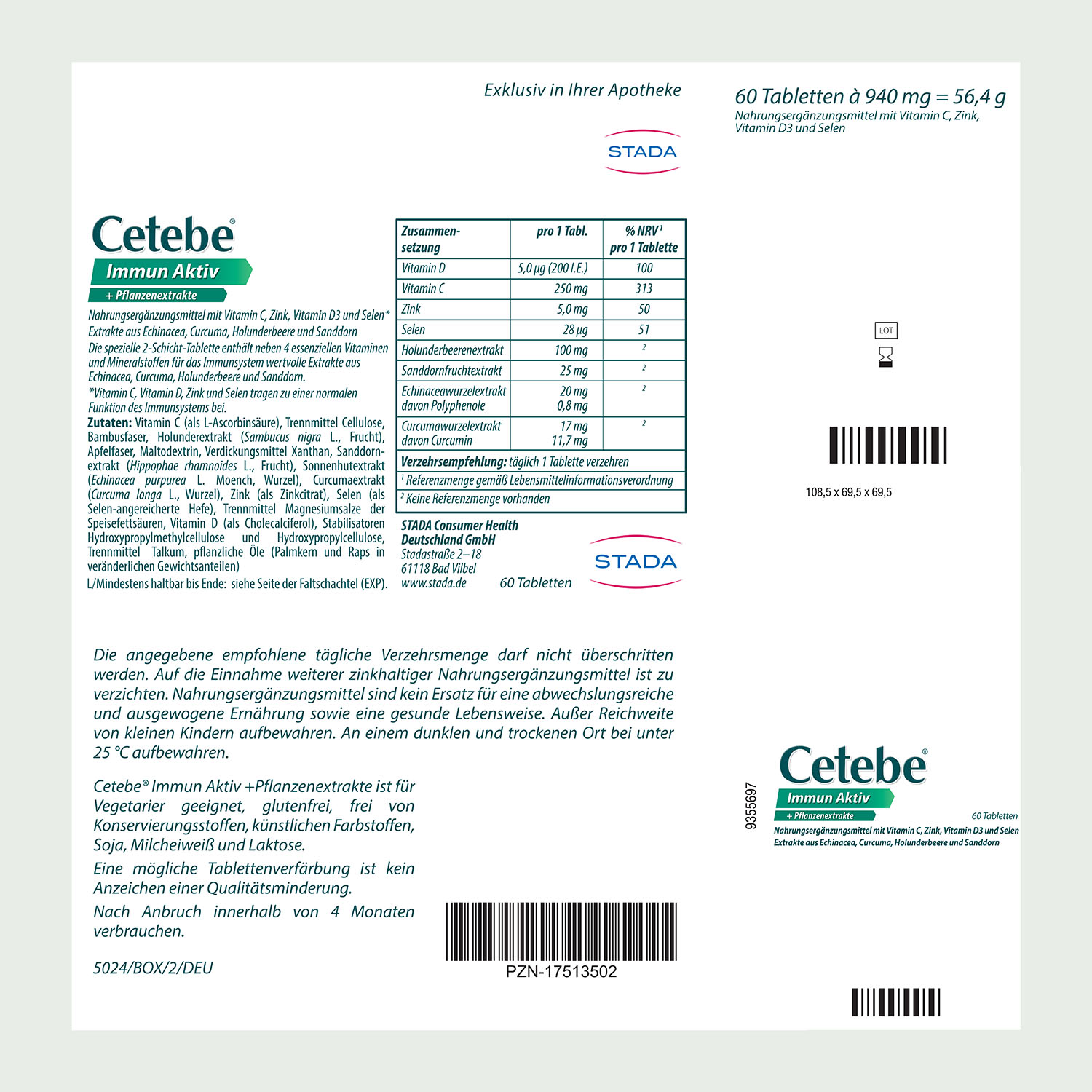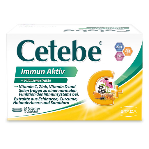 Cetebe® Immun Aktiv liefert mit Vitamin C, Zink, Vitamin D und Selen gleich 4 wichtige Nährstoffe, die jeweils die Körperabwehr unterstützen und so zu einer normalen Funktion des Immunsystems beitragen.