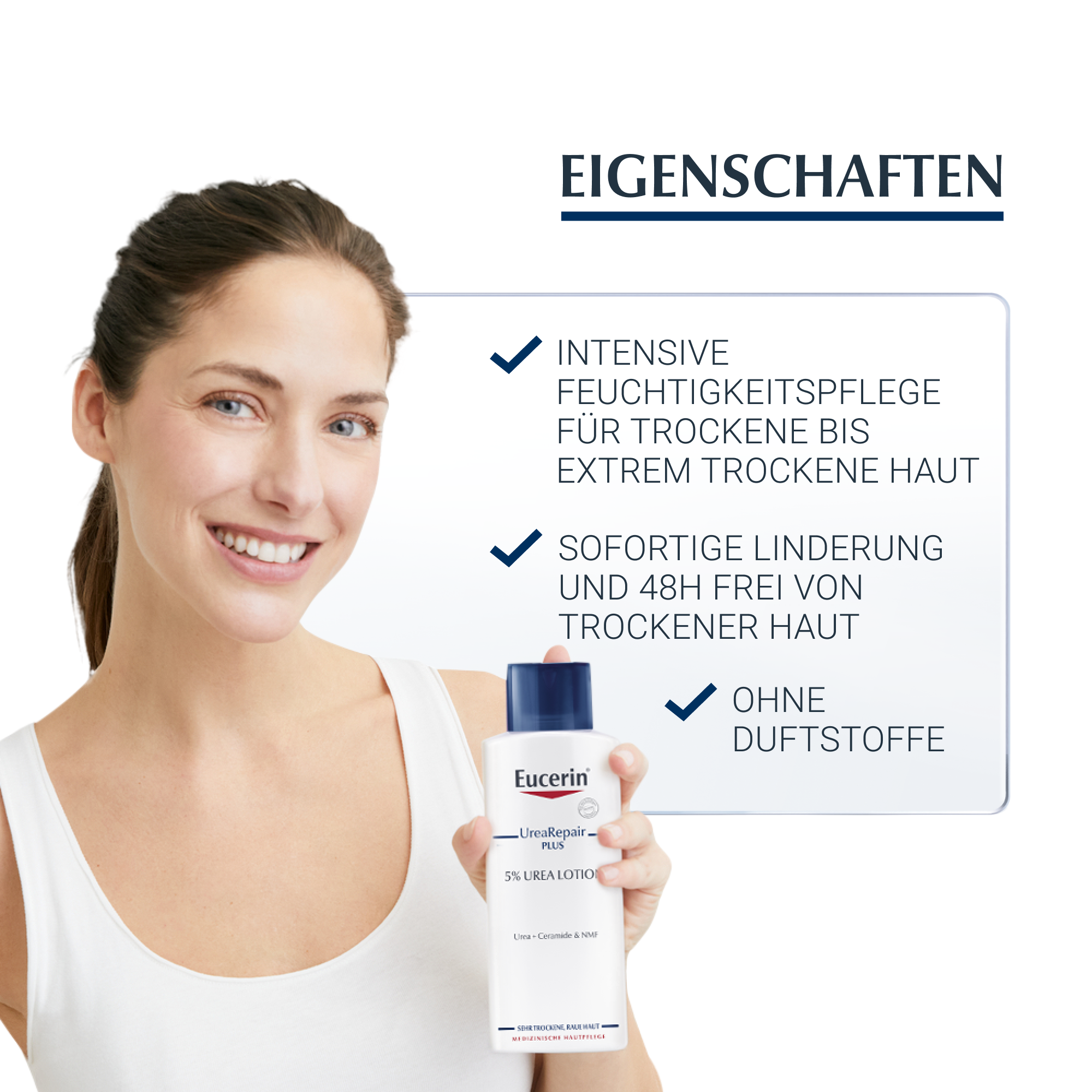 Die Eucerin UreaRepair 5% Urea Feuchtigkeitslotion pflegt als Körperlotion hochwirksam sehr trockene Haut. Die Pflegecreme spendet 48 Stunden langanhaltend Feuchtigkeit und lindert sofortig die Zeichen von sehr trockener Haut: Rauheit, Juckreiz und Spannungsgefühl.