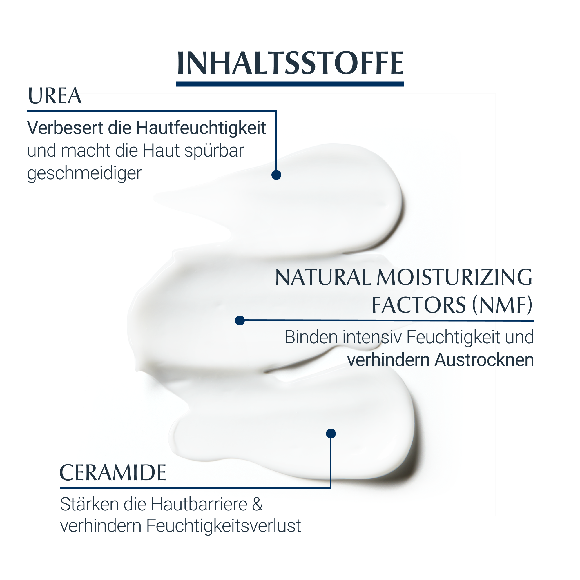 Urea gehört zu den Stoffen, die von der Haut zur Regulierung des Feuchtigkeitshaushalts gebildet werden – ein natürlicher Feuchthaltefaktor (Natural Moisturing Factor = NMF). Als hauteigener Wirkstoff wird Urea gut vertragen. Ceramide stärken die Hautbarriere, indem sie dazu beitragen, Feuchtigkeitsverluste durch Verdunstung zu verhindern und Reizstoffe abzuwehren, die Entzündungen und Juckreiz verursachen können. Die UreaRepair-Reihe bildet die natürliche Zusammensetzung der natürlichen Feuchtigkeitsspender gesunder Haut nach und gibt trockener Haut die Stoffe, die sie für eine optimale Feuchtigkeitsversorgung benötigt.